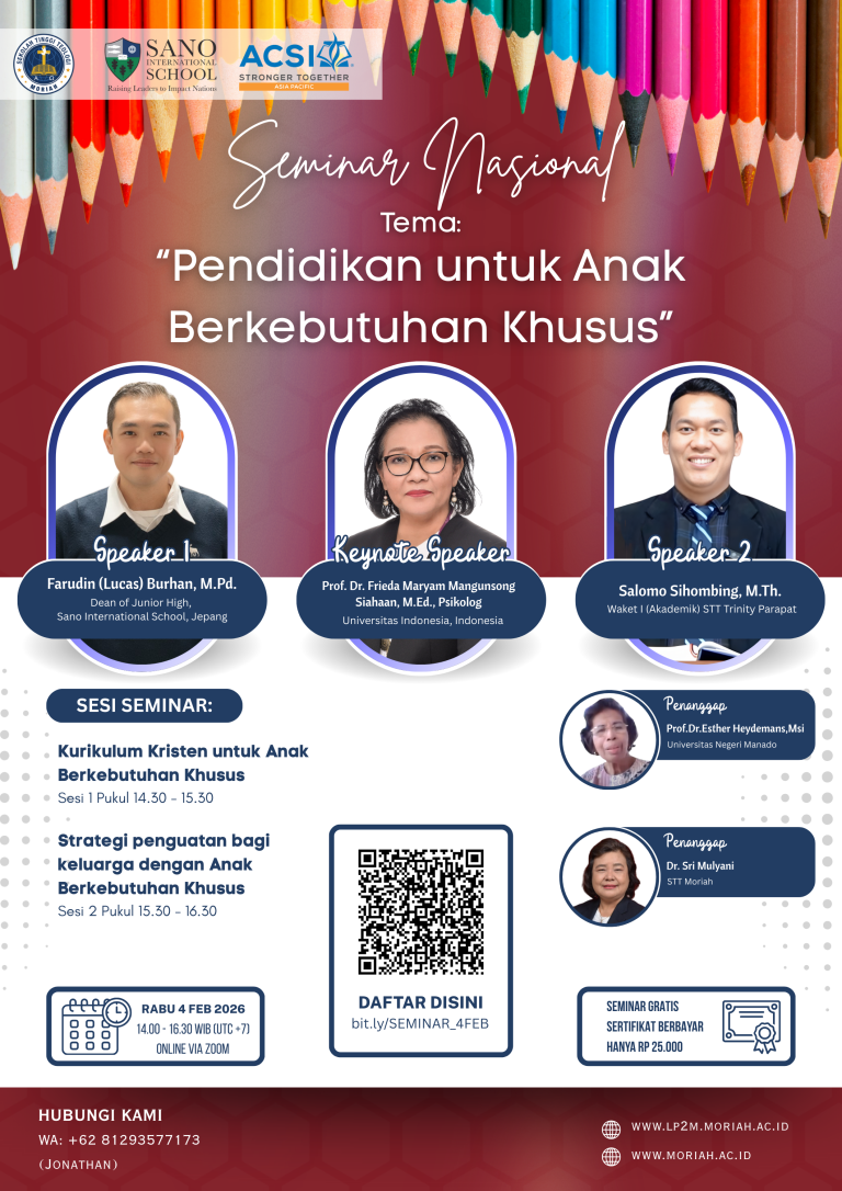 Shalom, Bapak/Ibu, Kami mengundang Bapak/Ibu untuk mengikuti Seminar Nasional yang diselenggarakan oleh LPPM STT Moriah, dengan tema: “Pendidikan untuk Anak …