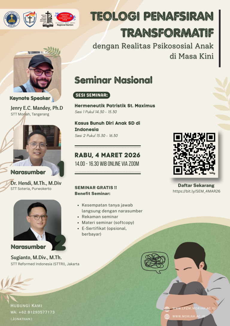 Shalom, Bapak/Ibu, Kami mengundang Bapak/Ibu untuk mengikuti Seminar Nasional yang diselenggarakan oleh LPPM STT Moriah, dengan tema: “Teologi Penafsiran Transformatif …